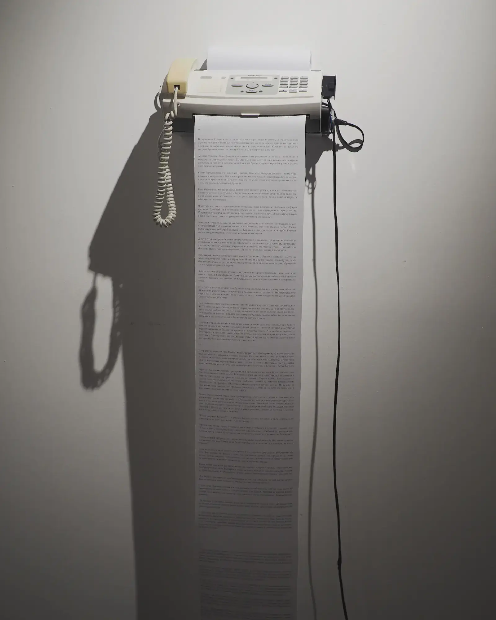“Black Fax off the Hook” is an insurrectionary transmission—a cultural guerrilla operation leveraging the destructive power of spam. In its most basic sense, a black fax can be defined as a malicious transmission, specifically a sheet of black print sent in rapid succession to a fax machine. This simple act overwhelms the machine’s ink and paper supply, a material assault akin to a digital denial-of-service attack, disrupting the machine’s functionality and rendering it impotent. This exhibit configures black faxing as a tool of psychopolitical derision, a constantly clicking fusillade of narrative flooding the space of perception. The exhibit reinterprets this as a critique of media saturation, where information becomes a relentless assault on cognitive bandwidth, paralyzing its audience into a state of psychic immobilization. In doing so, black faxing transforms into a weaponized inversion of Bulgarian mainstream media, and political populist tactics at large, which wage a campaign of total info-saturation on the public consciousness, entrapping the citizenry in a state of an anything-goes regime of public politics.