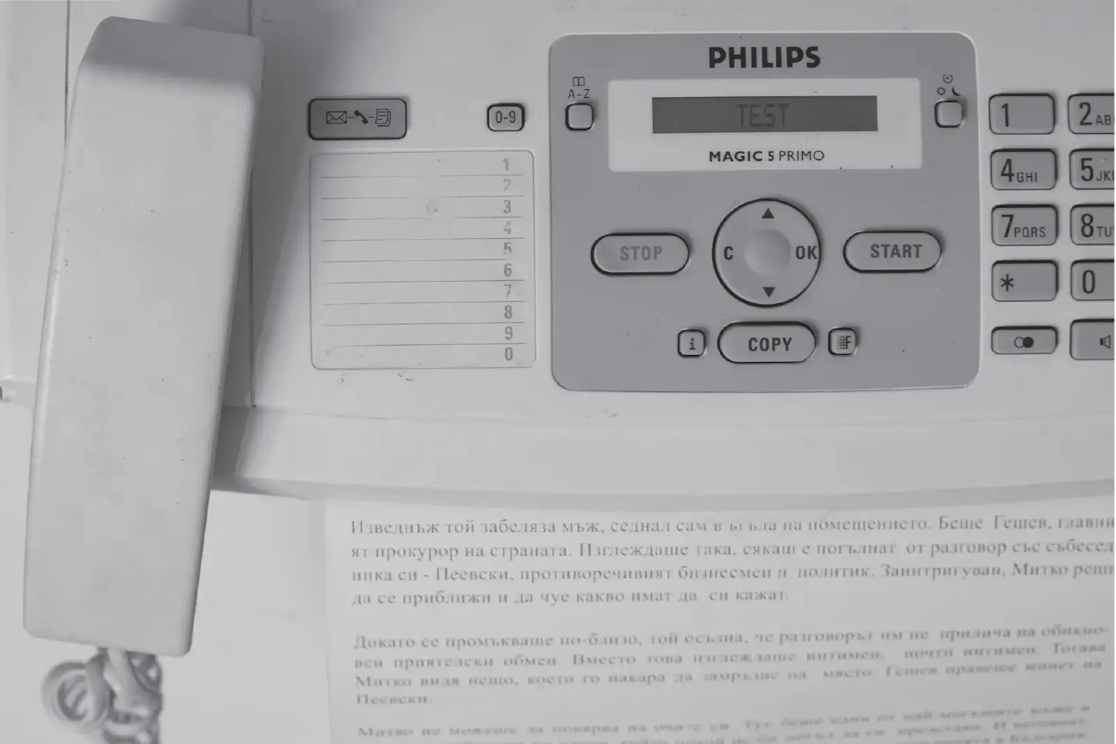 To “receive a fax” in Bulgarian idiom is to be struck by an intrusive idea, a sudden pulse from the without. On the other hand the slang term “ченге” (from the Turkish, meaning “hook”) carries connotations of entrapment, referring both to a policeman and, crucially, to an agent of the former State Security Services (Д.С.) during the communist era—figures of enmeshed culpability, guardians of repressive continuity and so called “Quiet Front”. Many protagonists of this installation remain entangled in the remnants of this apparatus to this day. Here the double translated tittle plays on the duplicity of language and slang with „off the hook” mirroring the Bulgaria „от ченге” (literary meaning “from a cop”) suggesting the tendency of such materials to be used as kompromats (blackmail material).